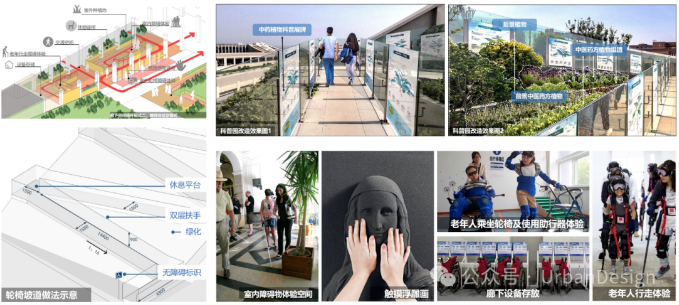 康復(fù)大學(xué)校園無障礙建設(shè)中,結(jié)合景觀環(huán)境,利用坡道柱廊下空間凈高 3.5~8.5m 區(qū)域及相鄰室外空間設(shè)置障礙體驗(yàn)區(qū),提供臺(tái)階障礙體驗(yàn)、視覺障礙體驗(yàn)與老年人障礙體驗(yàn)等,活化功能空間并突出康復(fù)教學(xué)特色,成為頗具特色的戶外教學(xué)場所(圖 19)。