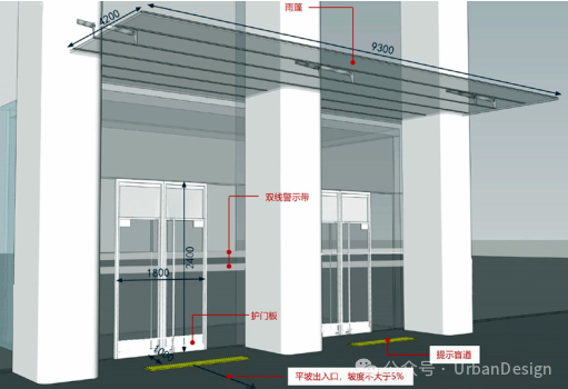 “創(chuàng)新核”主要出入口均為無障礙出入口(圖 11),并結(jié)合場地環(huán)境,采用坡度小于 5%的平坡出入口,形成便捷通暢的室內(nèi)外無障礙連通。出入口上方設(shè)置雨棚,外開門滿足單扇開啟時(shí)輪椅通行寬度要求,玻璃設(shè)置雙線提示帶,門斗滿足門扇開啟后的輪椅空間。