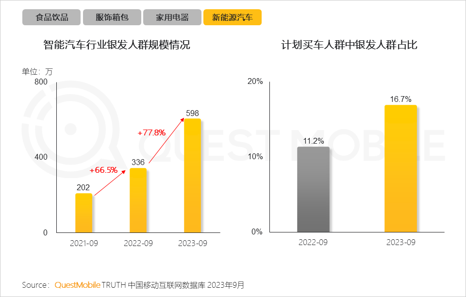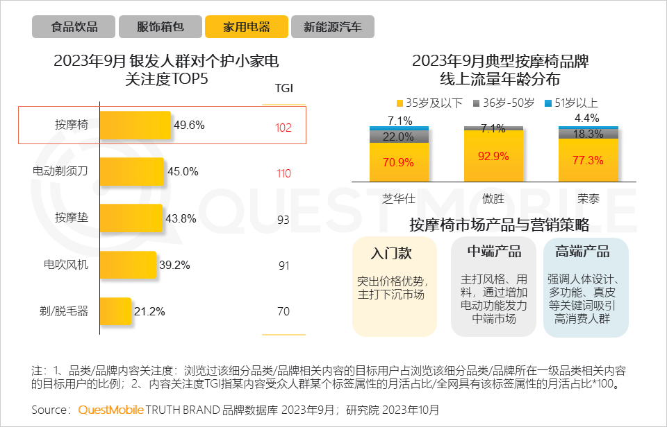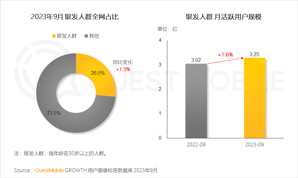 QuestMobile數(shù)據(jù)顯示,截止到2023年9月,銀發(fā)人群用戶規(guī)模已達(dá)到3.25億,同比增長了7.6%;全網(wǎng)占比已經(jīng)達(dá)到26.5%,同比提高了1.3個百分點。同時,銀發(fā)群體線上消費能力、消費意愿也在提升,9月份,銀發(fā)人群千元以上消費能力占比較去年同期增加了1.6%,中高端消費意愿占比較去年同期增加了2.4%。銀發(fā)經(jīng)濟消費潛力如何挖掘?不妨看報告吧。