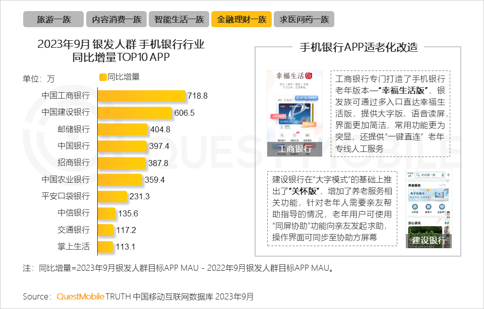 9、移動支付方面,各大國有及股份制銀行加快完成適老化進(jìn)程,各手機銀行APP紛紛開發(fā)出適合老年群體的專屬界面,為銀發(fā)人群辦理金融業(yè)務(wù)提供更好的體驗,進(jìn)而進(jìn)一步獲得用戶擁躉。