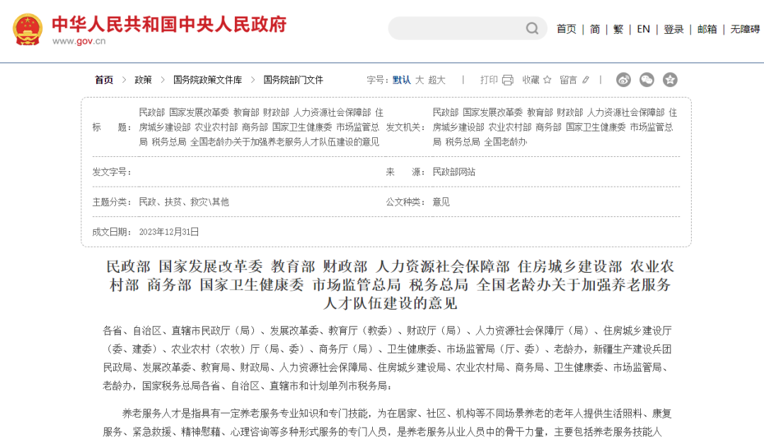 近日,民政部等12個部門制定出臺《關(guān)于加強(qiáng)養(yǎng)老服務(wù)人才隊(duì)伍建設(shè)的意見》(以下簡稱“意見”),這是我國首個關(guān)于養(yǎng)老服務(wù)人才隊(duì)伍建設(shè)的綜合性政策文件。