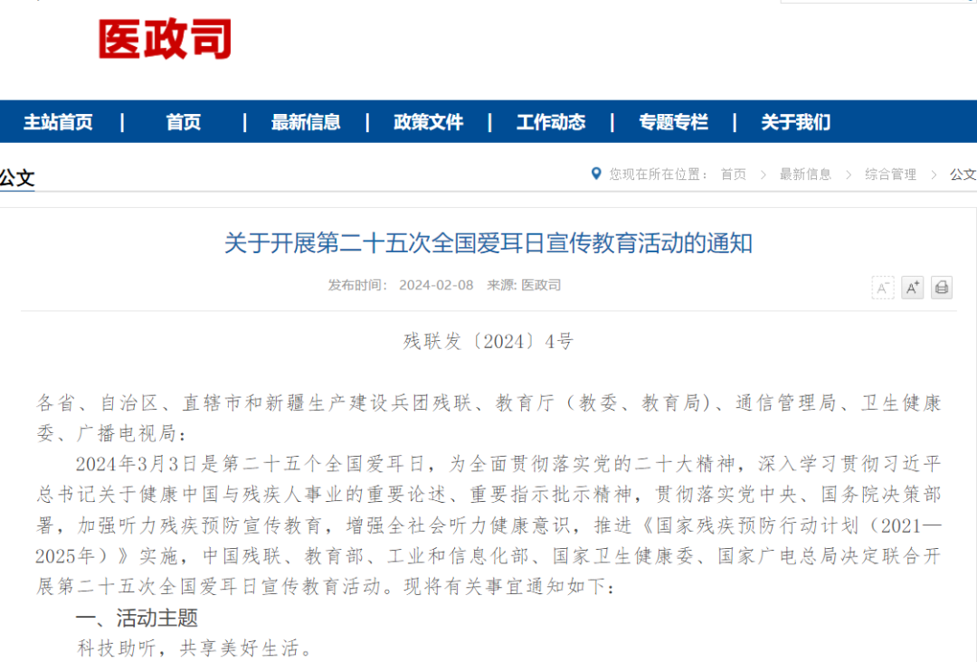 今年3月3日是第二十五個全國愛耳日,主題為“科技助聽,共享美好生活”。中國殘疾人聯(lián)合會、教育部、工業(yè)和信息化部、國家衛(wèi)生健康委員會、國家廣播電視總局日前聯(lián)合發(fā)布《關(guān)于開展第二十五次全國愛耳日宣傳教育活動的通知》,旨在加強聽力殘疾預(yù)防宣傳教育,增強全社會聽力健康意識,推進《國家殘疾預(yù)防行動計劃(2021—2025年)》實施。