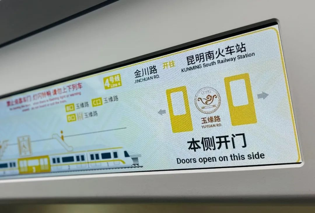 在車站內(nèi),昆明地鐵4號線公告欄新增公示公告適老化二維碼,乘客可通過掃描二維碼獲取具備大字、語音播報功能的公示公告;在列車上,新版列車動態(tài)地圖固定顯示乘車信息、新增關(guān)鍵信息顯示、增大字體內(nèi)容;列車上可顯示新增服務(wù)熱線、各出入口周邊信息、設(shè)施信息等8個關(guān)鍵信息,以及車站衛(wèi)生間、站臺至站廳樓梯、扶梯、無障礙電梯等區(qū)域的位置;非開門側(cè)固定顯示線路圖,增大顯示對側(cè)開門信息,新增預(yù)計到站時間以及各換乘站換乘線路信息……