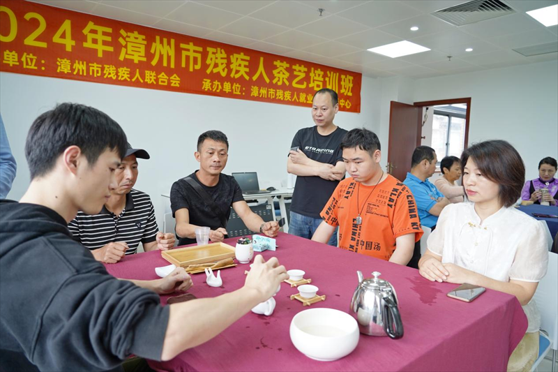 近日,由漳州市殘聯(lián)主辦、漳州市殘疾人就業(yè)服務(wù)指導(dǎo)中心承辦的2024年漳州市殘疾人茶藝培訓(xùn)班在漳州市國家級殘疾人職業(yè)培訓(xùn)基地舉辦。在老師指導(dǎo)下,30名殘疾人學(xué)員逐漸掌握了茶葉沖泡的技巧。