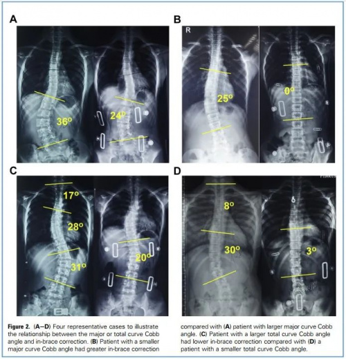 研究發(fā)現(xiàn),隨著脊柱側(cè)彎主彎Cobb角度和側(cè)彎總Cobb角度(全脊柱中所有側(cè)彎Cobb角度之和)的加大,支具即刻矯形率相應(yīng)地下降,兩者呈負相關(guān)。本研究還闡明了其他一些因素和初次支具治療矯形率的關(guān)系,為支具的設(shè)計和制造提供了十分寶貴的信息和參考,對控制進展、減少手術(shù)需要、提高患者生活質(zhì)量有十分重要的意義。
