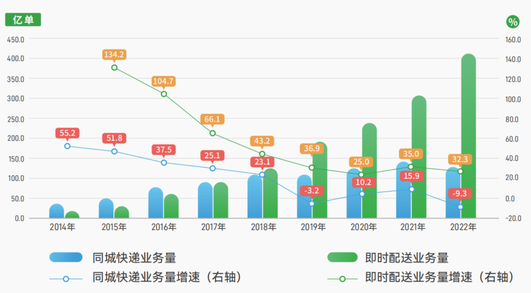 2014-2022年同城快遞和即時(shí)配送業(yè)務(wù)量和增速
