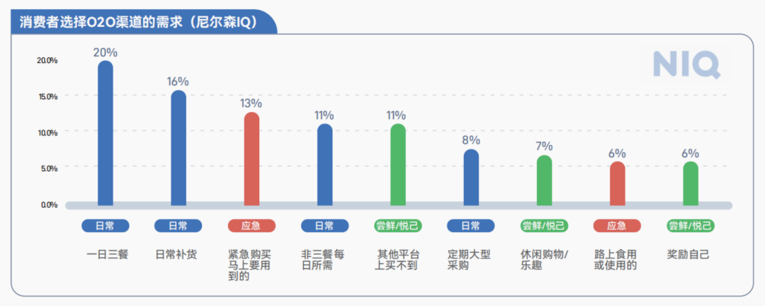 當(dāng)前即時(shí)零售消費(fèi)需求從應(yīng)急走向日常,在到店消費(fèi)、B2C和O2O即時(shí)到家三大消費(fèi)場(chǎng)景中,將逐步從到店、B2C轉(zhuǎn)向O2O即時(shí)到家。全品類(lèi)、全時(shí)段、全場(chǎng)景即時(shí)零售消費(fèi)需求持續(xù)增長(zhǎng)。消費(fèi)者選擇O2O模式的需求更趨于日?;?,“一日三餐”和“日常補(bǔ)貨”排名在前兩位,已經(jīng)不單純是應(yīng)急需求。O2O將為實(shí)體店插上騰飛的翅膀,“萬(wàn)物到家”將是未來(lái)必然趨勢(shì)。