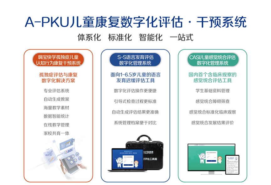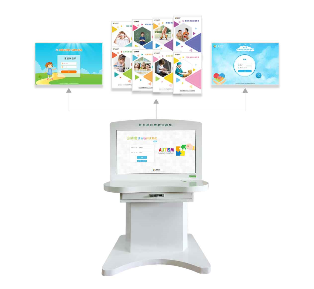 孤獨(dú)癥評(píng)估與康復(fù)系統(tǒng)由數(shù)字康復(fù)管理平臺(tái)(醫(yī)療級(jí)推車)及多臺(tái)康復(fù)終端設(shè)備組成,適用于孤獨(dú)癥譜系障礙及相關(guān)發(fā)育障礙患者的篩查、評(píng)估和康復(fù)治療。本系統(tǒng)搭載了一系列專業(yè)的篩查評(píng)估工具,創(chuàng)新性地采用“基于測(cè)評(píng)結(jié)果智能匹配個(gè)別化康復(fù)計(jì)劃”的解決方案,契合并滿足了高效評(píng)估、臨床康復(fù)、居家訓(xùn)練、康復(fù)管理等場(chǎng)景的需求,切實(shí)提升了康復(fù)服務(wù)的效率和效果。