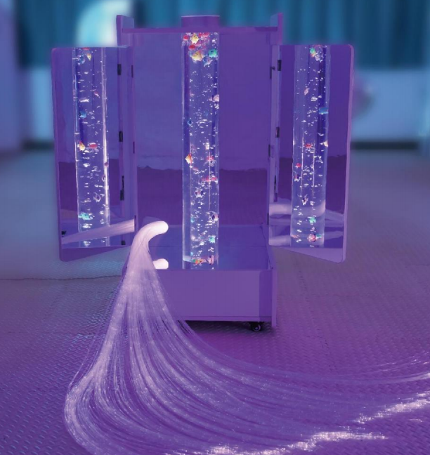 這款感官統(tǒng)合產(chǎn)品是專為兒童設(shè)計(jì)的,尤其適用于自閉癥和失語癥患者,外觀是一個(gè)可移動(dòng)雙開門的柜子,產(chǎn)品內(nèi)部左右和底部設(shè)有鏡子,還有一根透明的亞克力柱,可產(chǎn)生多種七彩變光效果,并產(chǎn)生大量細(xì)小而均勻的氣泡,這些氣泡通過氣泡水柱上升,帶來微小的觸覺刺激,幫助放松身心,有一堆的光纖由柜子里面延伸而出,能隨著氣泡柱的變化而變化七彩顏色。坐在光纖氣泡柜旁邊,專注于觀察和感受水柱的運(yùn)動(dòng)氣泡的觸感和七彩變光的美感,對(duì)于自閉癥和失語癥患者,這個(gè)過程可以激發(fā)他們的感官注意力、幫助他們表達(dá)情感,并促進(jìn)社交互動(dòng)。