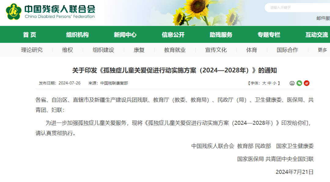 2024年7月21日,中國殘聯(lián)、教育部、民政部、國家衛(wèi)生健康委、國家醫(yī)保局、共青團中央、全國婦聯(lián)等七部門,聯(lián)合印發(fā)《孤獨癥兒童關愛促進行動實施方案(2024-2028年)》(以下簡稱《方案》)。