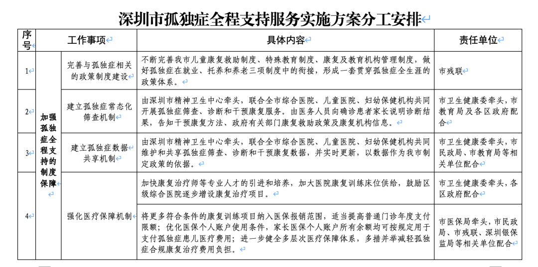 在此之前,深圳市已于2023年10月印發(fā)《深圳市孤獨癥全程支持服務實施方案》,提出六大方面31項工作任務,希望實現(xiàn)的工作目標是:
