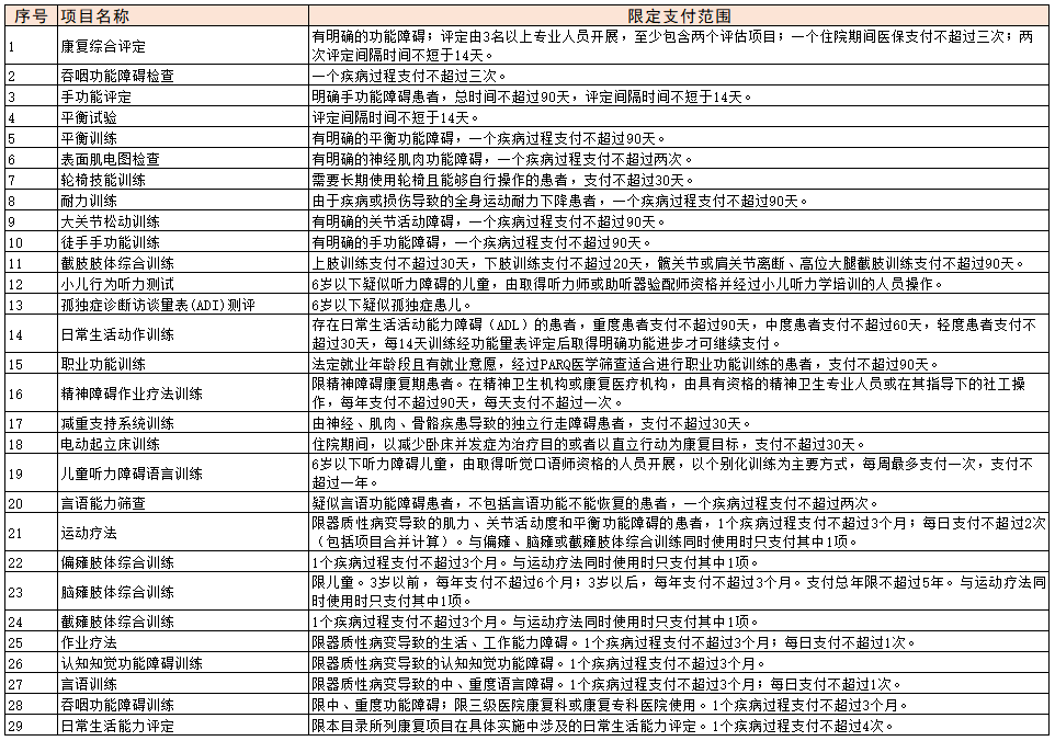 而醫(yī)療保障方面,根據(jù)“衛(wèi)農(nóng)衛(wèi)發(fā)〔2010〕80號”和“人社部發(fā)〔2016〕23號”兩個文件,目前一共有29項醫(yī)療康復項目納入基本醫(yī)療保險支付范圍。