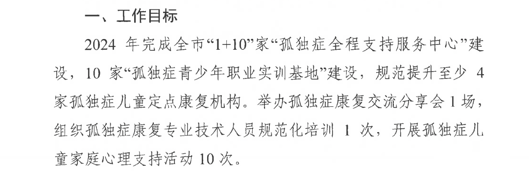 “持續(xù)提升孤獨癥早期篩查、診斷、康復水平,推進孤獨癥兒童融合教育,促進成年孤獨癥就業(yè),加強重癥孤獨癥托養(yǎng),做好孤獨癥民生兜底保障和無障礙環(huán)境建設,建立完善我市孤獨癥全程支持服務體系。”