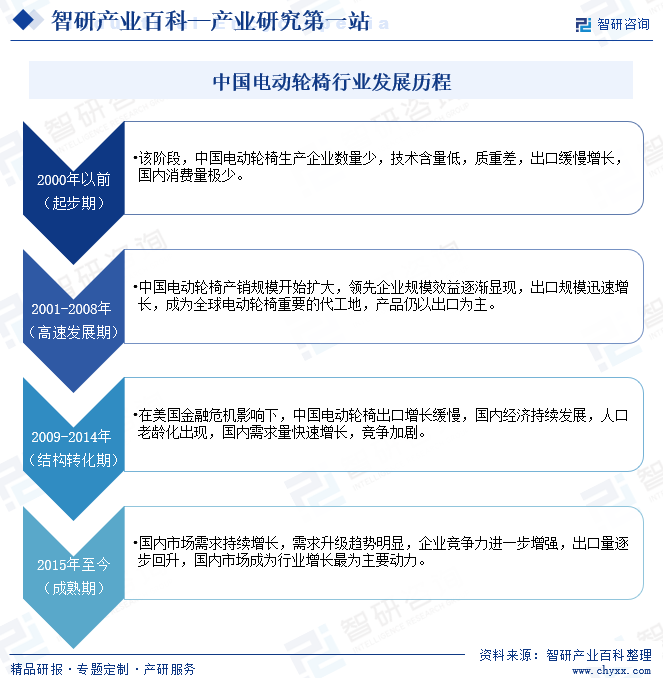中國電動輪椅行業(yè)發(fā)展主要經歷了四個階段。2000年以前的起步期,中國電動輪椅生產企業(yè)數量少,技術含量低,質量差,出口緩慢增長,國內消費量極少。2001-2008年的高速發(fā)展期,中國電動輪椅產銷規(guī)模開始擴大,領先企業(yè)規(guī)模效益逐漸顯現(xiàn),出口規(guī)模迅速增長,成為全球電動輪椅重要的代工地,產品仍以出口為主。2009年至2014年的結構轉化期,在美國金融危機影響下,中國電動輪椅出口增長緩慢,國內經濟持續(xù)發(fā)展,人口老齡化出現(xiàn),國內需求量快速增長,競爭加劇。2015年至今的成熟期,國內市場需求持續(xù)增長,需求升級趨勢明顯,企業(yè)競爭力進一步增強,出口量逐步回升,國內市場成為行業(yè)增長最為主要動力。