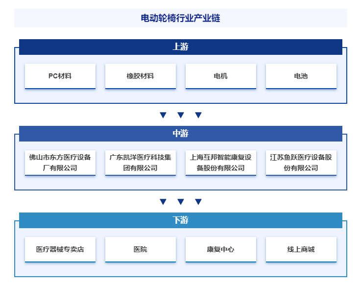 電動輪椅產業(yè)鏈上游為PC材料、橡膠材料、鋁合金、電機、電池、控制器、傳感器等。產業(yè)鏈中游為電動輪椅的生產制造商。產業(yè)鏈下游為醫(yī)療器械專賣店、醫(yī)院、康復中心、線上商城等。終端用戶包括老年人、殘疾人、傷病恢復者等需要輔助移動的群體。