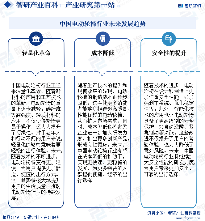隨著中國人口老齡化的逐漸加劇,對電動輪椅等康復輔助器具的需求持續(xù)增長。國家通過相關政策推動康復醫(yī)療與康復輔助器具配置服務的銜接融合,為電動輪椅等產品的市場需求提供了有力保障。2024年1月,國務院印發(fā)《關于發(fā)展銀發(fā)經濟增進老年人福祉的意見》,提出大力發(fā)展康復輔助器具產業(yè)。推動助聽器、矯形器、拐杖、假肢等傳統(tǒng)功能代償類康復輔助器具升級,發(fā)展智能輪椅、移位機、康復護理床等生活照護產品。在政策推動下,電動輪椅行業(yè)將加快技術創(chuàng)新和產品升級。隨著政策的推動和市場需求的增長,電動輪椅行業(yè)將逐漸實現(xiàn)標準化和規(guī)范化發(fā)展。這將有助于提升產品的質量和安全性,降低生產成本和售價,進一步促進市場的擴大和普及。