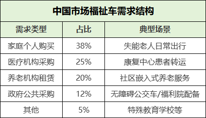雖然普及度低,但實(shí)際上殘疾人和老年人對(duì)福祉車的需求相當(dāng)強(qiáng)烈。目前家庭個(gè)人購買福祉車的需求占比38%,其次是醫(yī)療機(jī)構(gòu)采購、養(yǎng)老機(jī)構(gòu)租賃等。
