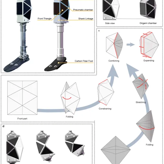 北京大學(xué)工學(xué)院先進(jìn)制造與機(jī)器人系王啟寧教授課題組則研發(fā)出了全球首款基于折紙結(jié)構(gòu)的仿生軟體膝關(guān)節(jié)假肢。該款假肢受到馬尾草啟發(fā),主體由熱塑性聚氨酯3D打印制成,膝關(guān)節(jié)單元重量?jī)H300g,假肢高度僅15cm,折紙結(jié)構(gòu)的大范圍折展特性,可滿足膝關(guān)節(jié)大范圍運(yùn)動(dòng)的要求。
