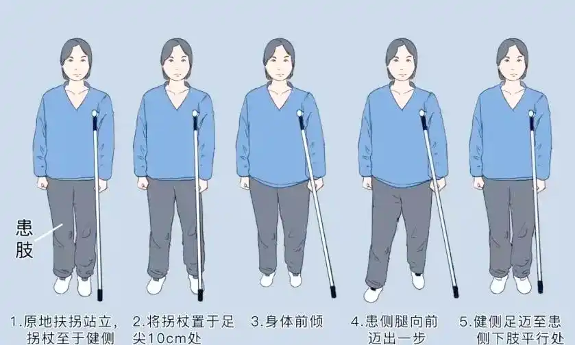 單拐步行技巧:將拐杖置于健側(cè),步行時應(yīng)遵循以下順序:先伸出拐杖,緊接著邁出患側(cè)腿,最后健側(cè)腿跟上,以保持平衡。雙拐步行技巧:在步行時,首先將雙拐與患肢同時伸出,然后緊跟健側(cè)腿的邁出,以維持身體的平衡。請注意,患肢在此過程中需承擔部分體重。
