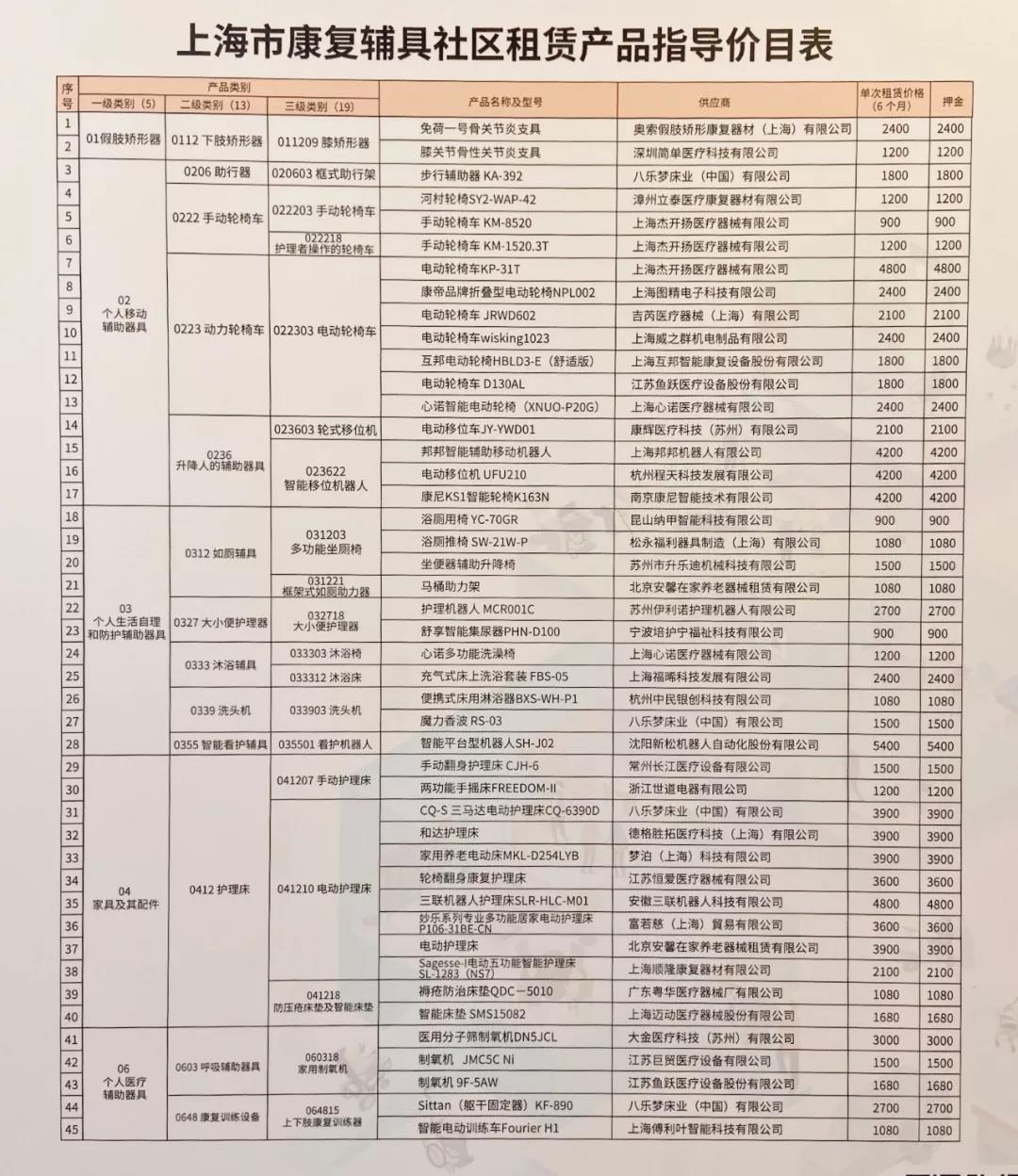 試點期間,每件產品租期均為半年,價格從900-4000多元不等,老人還需繳納一定金額的押金,租賃期結束后歸還。本市戶籍60周歲至74周歲低保、低收入老年人,75周歲(含)以上老年人可申請租賃服務補貼,補貼金額為租賃價格的50%,每人每年補貼上限為3000元。(下方價目表僅供參考,仍在實施調整中)