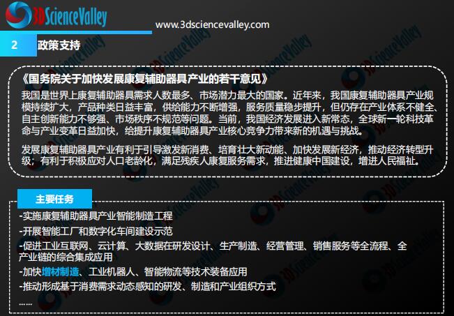 隨著市場對醫(yī)療器具的需求不斷攀升,3D打印以其“增材制造”的優(yōu)勢,在醫(yī)療器具的研發(fā)生產(chǎn)上贏得了國家在政策上的支持:在2018年國家康復輔具研究中心牽頭申報的“仿生假肢手感知與控制的神經(jīng)信息解析和交互技術研究”以及“假肢矯形器的個性化設計與增材制造應用示范”兩項項目均獲批立項,中央財政資助經(jīng)費分別為2380萬元和931萬元。