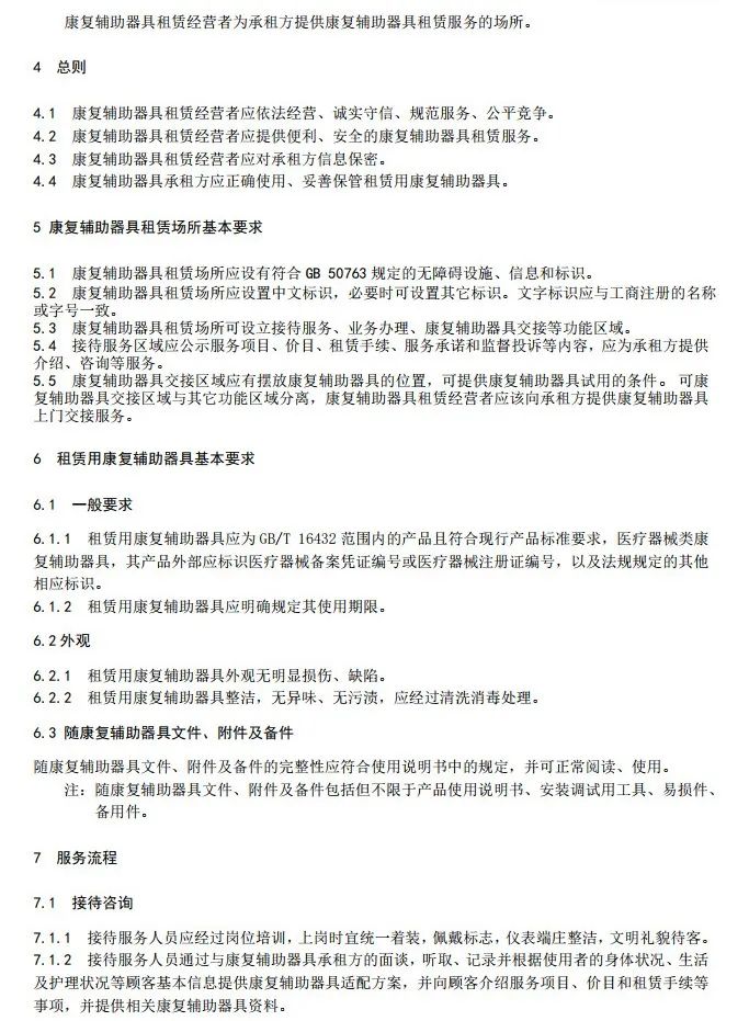 該意見稿從租賃場(chǎng)所、租賃用康復(fù)輔具、服務(wù)流程、租賃費(fèi)用結(jié)算、租后服務(wù)、投訴與處理、人員培訓(xùn)等7個(gè)方面規(guī)定了康復(fù)輔具租賃服務(wù)的基本要求。