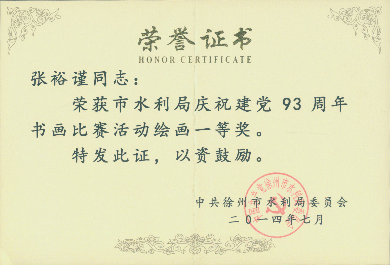近日,市水利局舉辦慶祝建黨93周年書畫比賽活動。本次書畫比賽以“學(xué)黨史、知黨情、跟黨走”為宗旨,以“濃墨書華誕,丹青繪七一”為主題,緊密圍繞建黨93周年,緊扣時代主旋律,踐行黨的群眾路線,以書畫形式思黨恩、頌黨情、贊黨績,謳歌黨的豐功偉績,加強(qiáng)了水利局書畫愛好者之間的交流溝通。本次書畫比賽共收到到毛筆書法、硬筆書法、國畫、工筆畫等作品30余幅并進(jìn)行集中展出,參賽作品主題鮮明,內(nèi)容豐富,充分反映了水利系統(tǒng)干部職工熱愛黨、熱愛祖國、熱愛社會主義,創(chuàng)先爭優(yōu)的良好精神風(fēng)貌。經(jīng)組委會最終評定,我院職工張?jiān)V?jǐn)最終獲得軟筆書法、繪畫一等獎。