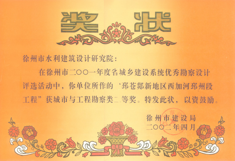 《邳蒼郯新地區(qū)西加河工程》市勘察二等獎(2002)